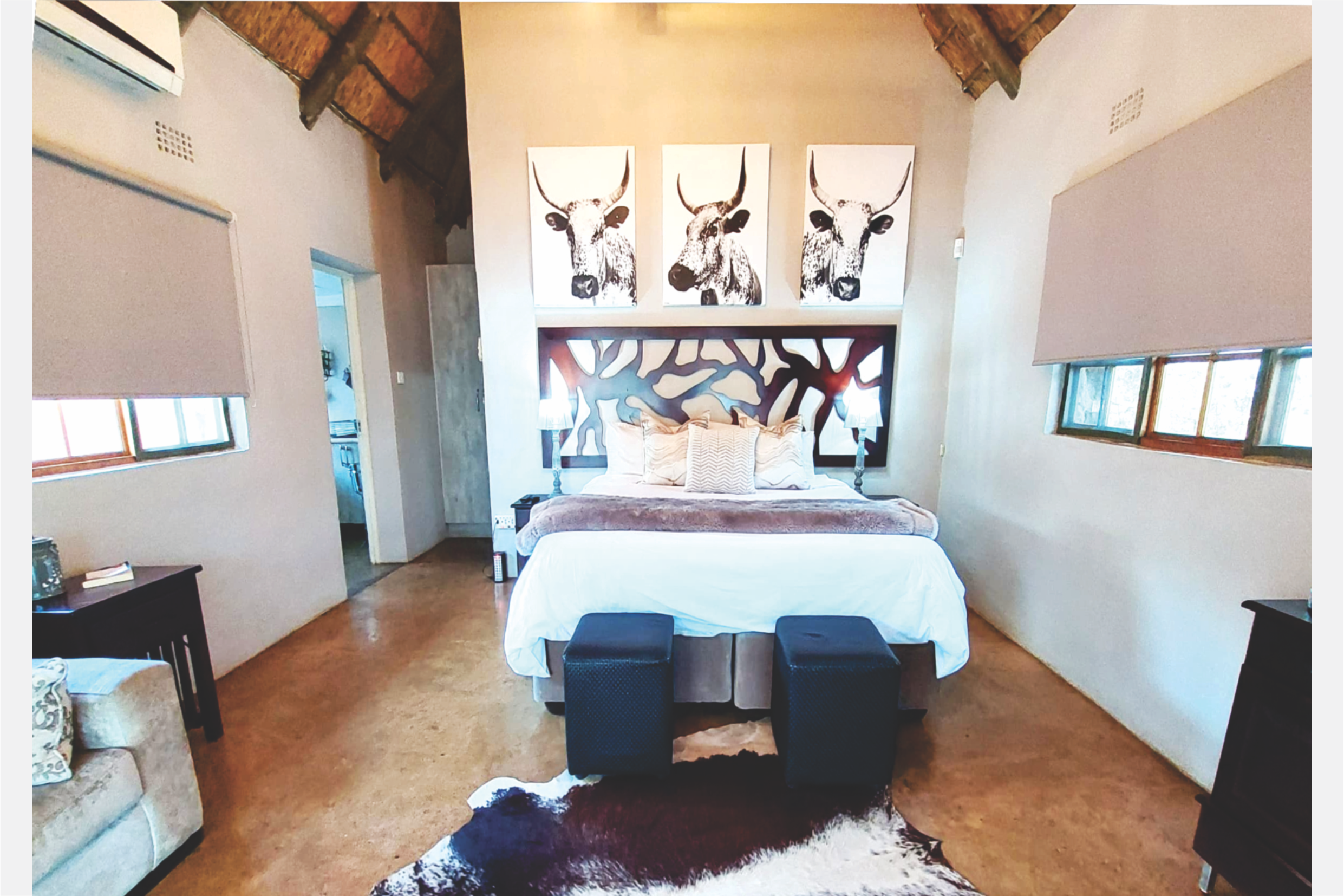 This cosy thatched cottage, sleeping a maximum of 3 people, aptly referred to as NGUNI COTTAGE has a view of Notwane Dam and has been tastefully decorated with an Nguni theme.
